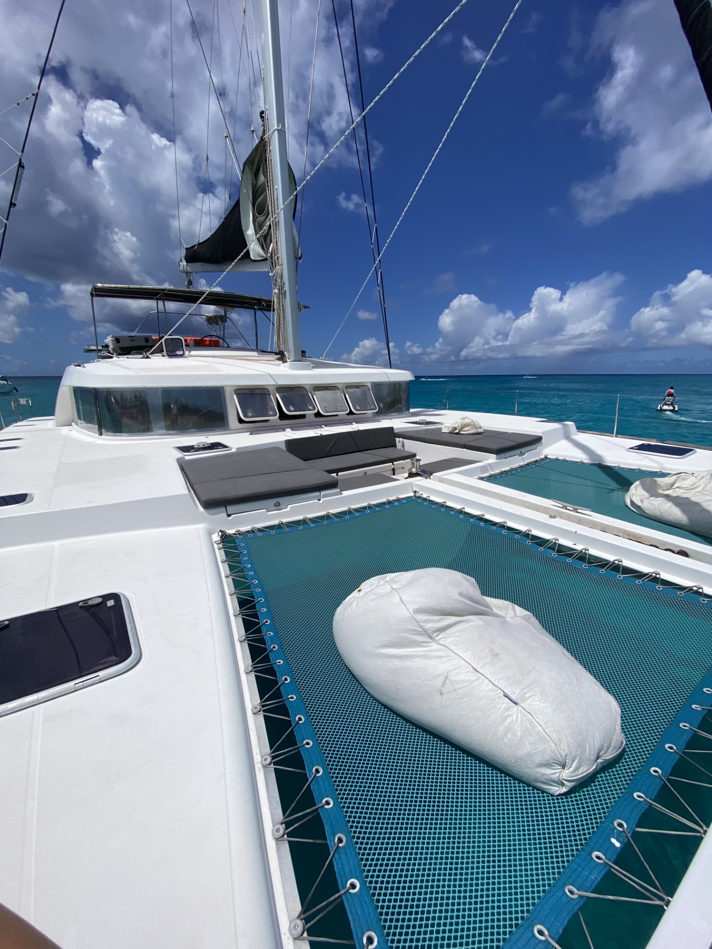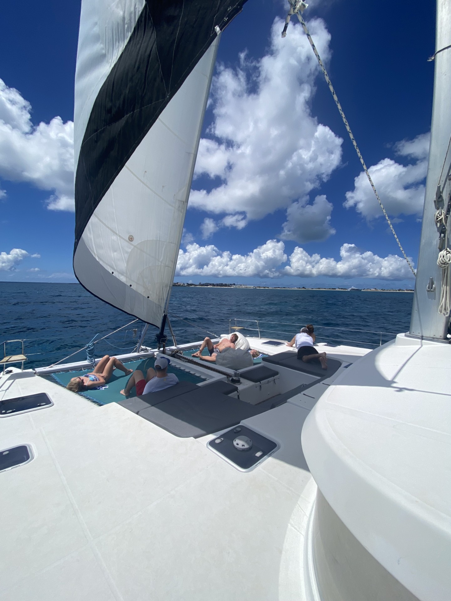 Guests spread out naturally across multiple lounging zones — the expansive forward trampolines, the shaded cockpit, and the elevated flybridge with panoramic views. The layout creates a social, open atmosphere where everyone can relax without ever feeling crowded.